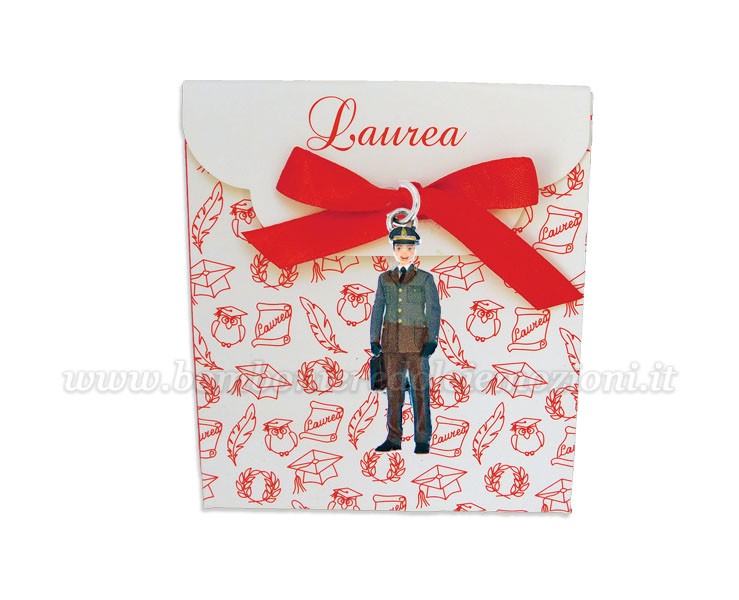 Celebra la laurea con questa raffinata bomboniera pensata per rendere unico il tuo evento speciale. Il ciondolo raffigura finanziere uomo con dettagli smaltati. Questo ciondolo incarna valori di onestà, disciplina e dedizione al servizio della giustizia economica, rendendolo un ricordo perfetto per chi celebra il proprio ingresso o avanzamento nella Guardia di Finanza. Realizzato in bagno argento smaltato di alta qualità, è un omaggio ideale per celebrare il successo accademico con stile. La bomboniera include una scatola in carta pregiata con decorazioni a tema laurea e un elegante fiocco rosso che dona un tocco di classe e armonia al packaging.