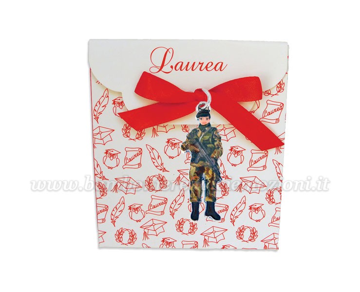 Il ciondolo raffigura una donna militare con dettagli smaltati. Questo ciondolo rappresenta i valori di coraggio, sacrificio e onore, rendendolo il simbolo perfetto per chi inizia o celebra un importante traguardo nella propria vita militare. Realizzato in bagno argento smaltato di alta qualità, è un omaggio ideale per celebrare il successo accademico con stile. La bomboniera include una scatola in carta pregiata con decorazioni a tema laurea e un elegante fiocco rosso che dona un tocco di classe e armonia al packaging.