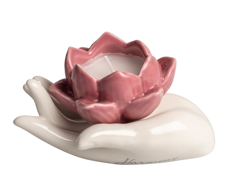 Candela Fiore Rosa su Mano in Porcellana Bianca