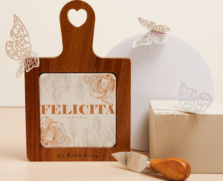 Questa elegante bomboniera unisce il calore naturale del legno con la raffinatezza della ceramica decorata, rendendo ogni tavola più accogliente. Il tagliere, di dimensioni 23 x 15 x 1,5 cm, è perfetto non solo come elemento decorativo, ma anche per servire piccoli stuzzichini o per dare un tocco di classe alla cucina. La scritta "Felicità" in rilievo sulla ceramica dona un tocco romantico e unico, ideale per un evento speciale come il matrimonio.