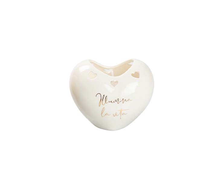 Dettagli Traforati: Nella parte superiore sono presenti piccoli cuori intagliati nella porcellana, che permettono alla luce della fiamma di creare suggestivi giochi d'ombra sulle pareti.
