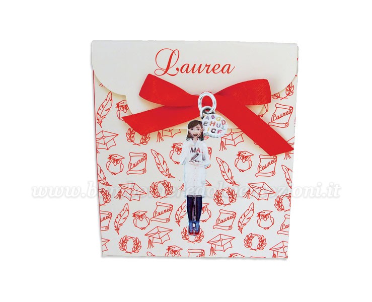 Celebra la laurea con questa raffinata bomboniera pensata per rendere unico il tuo evento speciale. Il ciondolo raffigura un logopedista donna con dettagli smaltati. Questo ciondolo rappresenta la passione e l’impegno per migliorare le capacità comunicative delle persone, rendendolo un simbolo perfetto per celebrare il traguardo accademico di chi si dedica a questa nobile professione. Realizzato in bagno argento smaltato di alta qualità, è un omaggio ideale per celebrare il successo accademico con stile. La bomboniera include una scatola in carta pregiata con decorazioni a tema laurea e un elegante fiocco rosso che dona un tocco di classe e armonia al packaging.