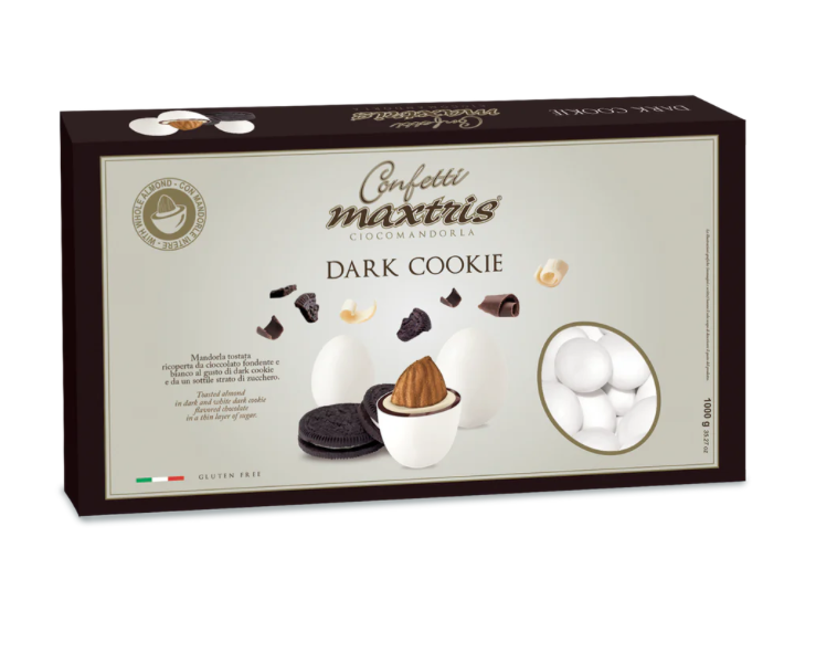I Confetti Maxtris Dark Cookie combinano la croccantezza di una mandorla tostata con la bontà di un doppio strato di cioccolato bianco e fondente, arricchito dall'inconfondibile sapore dei dark cookie. Un sottile strato di zucchero avvolge il confetto, rendendolo una scelta elegante e golosa per i tuoi momenti speciali.