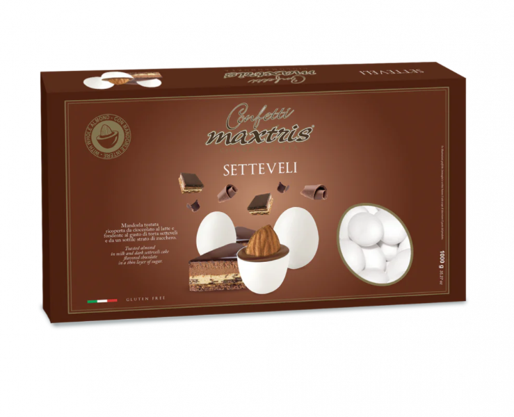 I Confetti Maxtris Setteveli offrono il sapore irresistibile della celebre torta setteveli in un elegante confetto. Ogni confetto contiene una mandorla tostata, avvolta in un doppio strato di cioccolato al latte e fondente, rifinito da un sottile strato di zucchero. Perfetti per sorprendere i tuoi ospiti con un'esperienza di gusto unica.