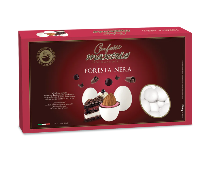 I Confetti Maxtris Foresta Nera racchiudono il sapore inconfondibile del famoso dolce tedesco. Ogni confetto è composto da una mandorla tostata, avvolta in un doppio strato di cioccolato bianco e fondente aromatizzato al gusto Foresta Nera, completato da un sottile strato di zucchero. Un connubio raffinato di sapori che richiama le note del cioccolato e della ciliegia.