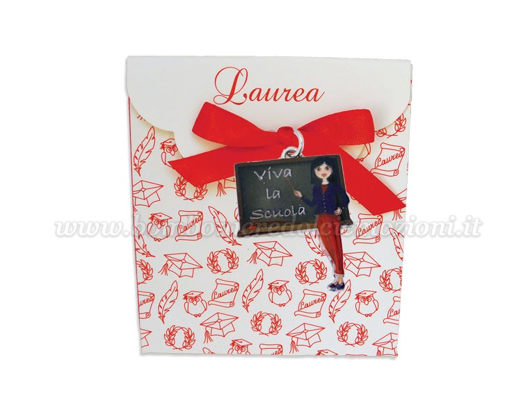 Celebra la laurea con questa raffinata bomboniera pensata per rendere unico il tuo evento speciale. Il ciondolo raffigura una docente con dettagli smaltati. Questo ciondolo celebra la passione per l'insegnamento e l'educazione, simbolizzando l'importanza del sapere e la dedizione nel formare le future generazioni. Un perfetto tributo per chi si è impegnato a diventare guida e mentore nel mondo della scuola. Realizzato in bagno argento smaltato di alta qualità, è un omaggio ideale per celebrare il successo accademico con stile. La bomboniera include una scatola in carta pregiata con decorazioni a tema laurea e un elegante fiocco rosso che dona un tocco di classe e armonia al packaging.