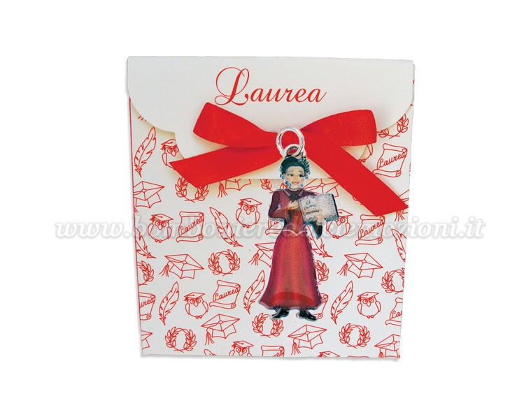 Celebra la laurea con questa raffinata bomboniera pensata per rendere unico il tuo evento speciale. Il ciondolo raffigura un insegnante di lettere femminile con dettagli smaltati. Questo ciondolo rappresenta la passione per le parole, i testi e le tradizioni culturali, celebrando il traguardo accademico di chi ha dedicato il proprio percorso allo studio delle discipline umanistiche e letterarie. Realizzato in bagno argento smaltato di alta qualità, è un omaggio ideale per celebrare il successo accademico con stile. La bomboniera include una scatola in carta pregiata con decorazioni a tema laurea e un elegante fiocco rosso che dona un tocco di classe e armonia al packaging.
