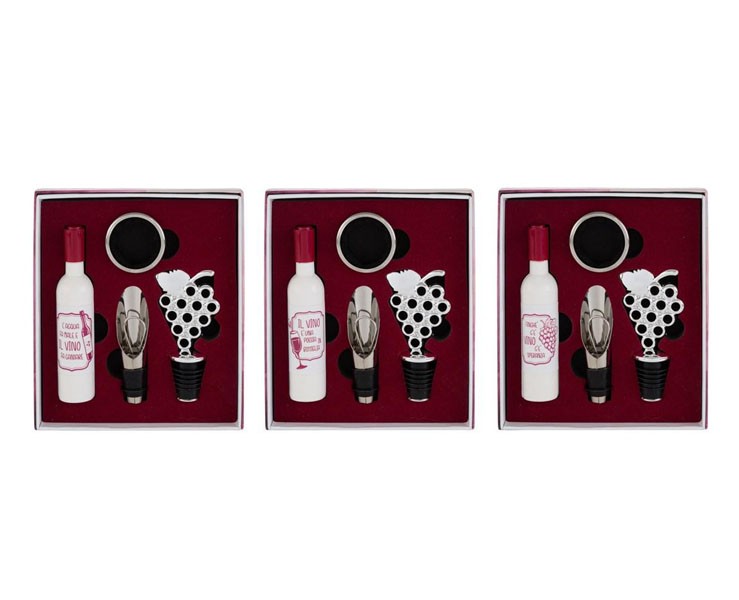Esalta il piacere del vino con questo raffinato set di 4 accessori, confezionato in un astuccio dal design elegante. Ogni set include una selezione di strumenti indispensabili per i veri amanti del vino, con dettagli unici a tema. Ideale come bomboniera per matrimoni, anniversari, e occasioni speciali, oppure come regalo raffinato per sommelier e appassionati.