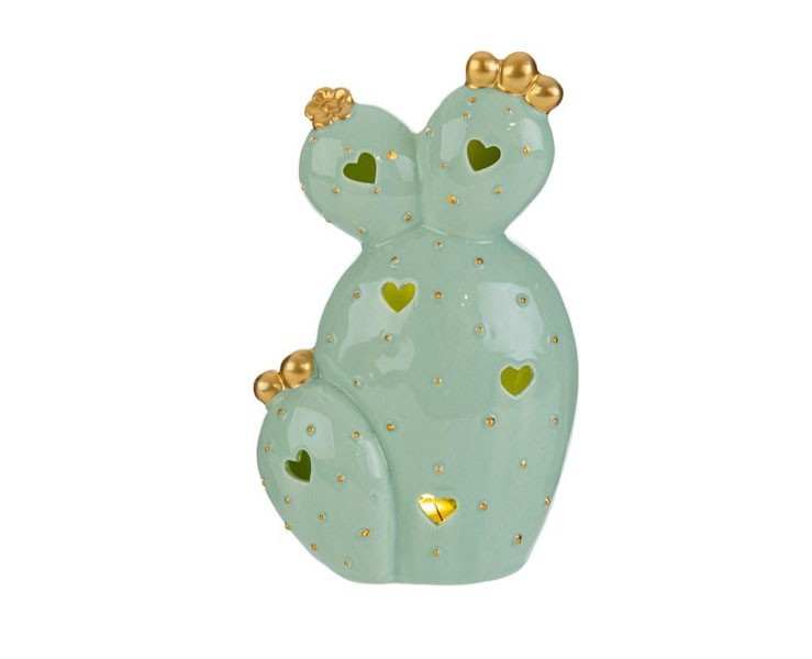 Illumina ogni occasione speciale con il cactus LED in porcellana verde, arricchito da eleganti dettagli dorati. Questo originale complemento d'arredo con luce LED integrata è perfetto come bomboniera per matrimoni, battesimi o anniversari, oppure come decorazione raffinata per la casa. La sua combinazione di design contemporaneo e funzione luminosa lo rende un regalo unico e di grande impatto.