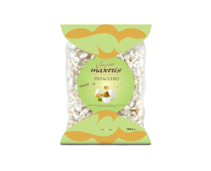 I Twist Maxtris Pistacchio sono confetti eleganti e irresistibili, perfetti per chi ama il sapore intenso e raffinato del pistacchio. Ogni confetto racchiude una mandorla tostata, avvolta in uno strato di cioccolato bianco aromatizzato al pistacchio e rifinita con un colore vivace per un tocco di stile.