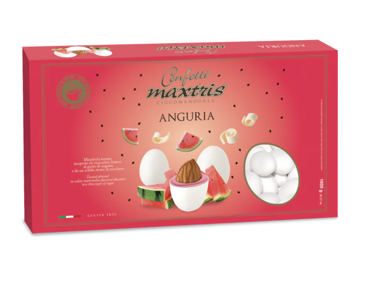 Rinfresca il tuo evento con i Confetti Maxtris Anguria, una deliziosa combinazione di sapori estivi e dolcezza raffinata. Ogni confetto racchiude una mandorla tostata, avvolta in uno strato di cioccolato bianco aromatizzato al gusto di anguria e completata con un sottile strato di zucchero, per un'esperienza di gusto fresca e originale.