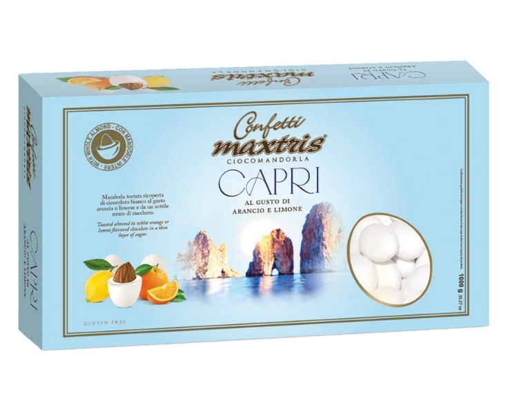 Porta un assaggio del Mediterraneo alle tue celebrazioni con i Confetti Maxtris Capri, ispirati alla magia dell'isola di Capri. Ogni confetto è composto da una mandorla tostata, avvolta in un cremoso strato di cioccolato bianco aromatizzato al gusto di arancia o limone, e racchiusa in un sottile strato di zucchero. Un mix di freschezza e dolcezza che regala un'esperienza unica ai tuoi ospiti.