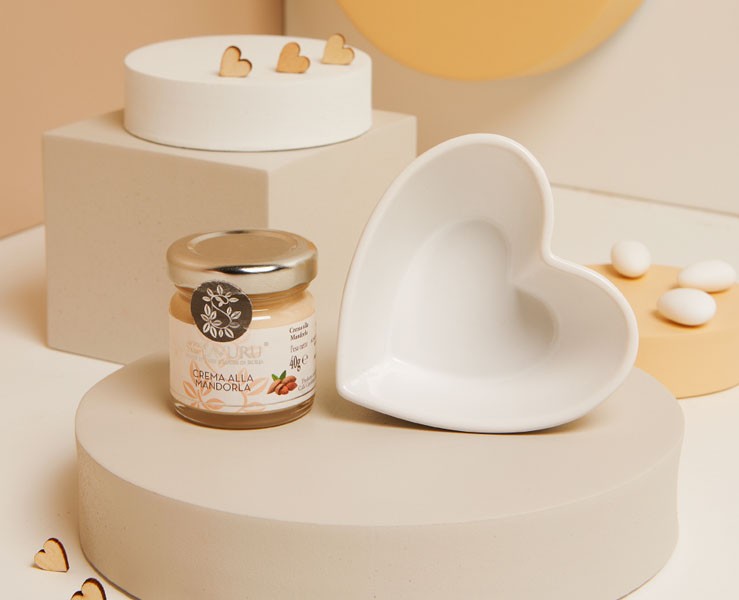 Un'idea raffinata e dolce, questa bomboniera include una splendida ciotolina a forma di cuore in porcellana, accompagnata da una deliziosa crema mandorlaa da 40 grammi. Perfetta per aggiungere un tocco gourmet e romantico alla tua cerimonia.