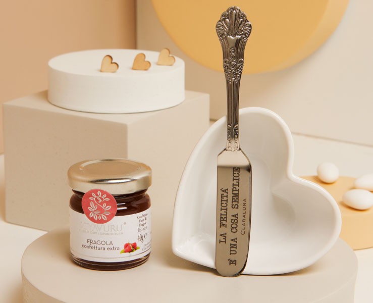 Bomboniera Matrimonio Claraluna Ciotolina Cuore con Coltellino e Marmellata di Fragola