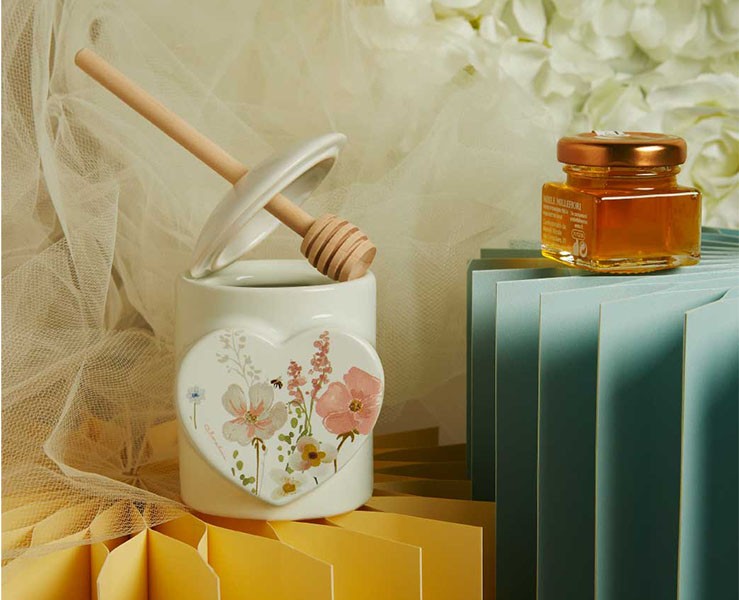 Bomboniera Claraluna 2026 Porta Miele con Miele e Spargimiele Decoro Floreale bianco