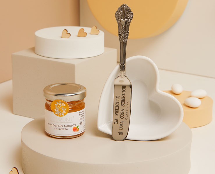 Bomboniera Matrimonio Claraluna Ciotolina Cuore con Coltellino e Marmellata di Mandarino