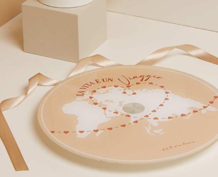 Un elegante vassoio girevole, decorato con il tema "La vita è un viaggio", perfetto per chi desidera aggiungere un tocco di stile e significato alla propria tavola. Ideale come bomboniera o per un regalo originale.