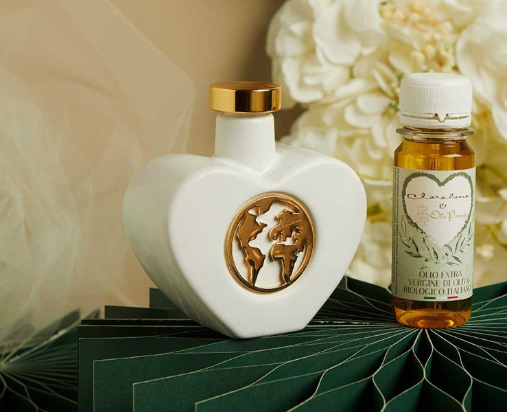 Bomboniera Matrimonio Claraluna 2026 Oliera Cuore Claraluna con Mondo Oro con olio