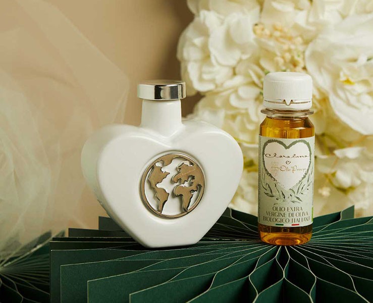 Bomboniera Matrimonio Claraluna 2026 Oliera Cuore Claraluna con Applicazione Mondo Silver con olio