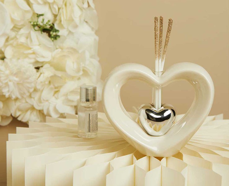 Bomboniera Claraluna 2026 Diffusore Cuore con Cuore silver – Diffusore elegante a forma di cuore in ceramica, con inserto cuore silver e bastoncini glitter, ideale come bomboniera romantica per matrimonio, anniversario o come raffinato regalo utile anche per Natale; un profumatore che unisce design moderno e simbolo d’amore, perfetto per impreziosire ogni ambiente (12.4×5.3×10.4 cm).