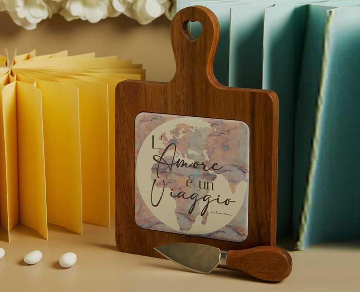 Bomboniera Claraluna 2026 Tagliere Acacia con Coltello Decorazione Mondo