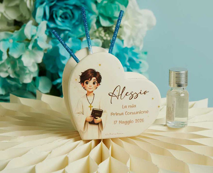 Il Diffusore Cuore Prima Comunione Maschietto Claraluna è una bomboniera raffinata e ricca di dolcezza, perfetta per celebrare il giorno speciale del Santo Prima Comunione del tuo bambino. La forma a cuore, simbolo di amore puro, accoglie l’illustrazione tenerissima del bimbo dagli occhi luminosi, rendendo questo profumatore un ricordo unico e pieno di emozione.