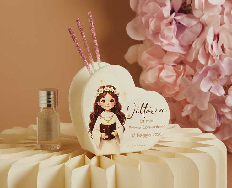 Il Diffusore Cuore Prima Comunione Bambina Claraluna è una bomboniera raffinata, dolce e ricca di poesia, pensata per celebrare il giorno speciale del Santo Prima Comunione della tua piccola.