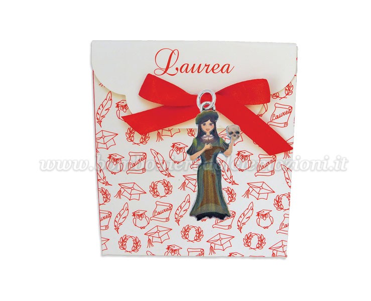 Celebra la laurea con questa raffinata bomboniera pensata per rendere unico il tuo evento speciale. Il ciondolo raffigura una filosofa con dettagli smaltati. Questo ciondolo rappresenta il pensiero critico, la ricerca del sapere e la riflessione sull’essenza dell’uomo, rendendolo un simbolo ideale per celebrare il successo accademico di chi si è dedicato allo studio della filosofia, delle lettere e delle scienze umane. Realizzato in bagno argento smaltato di alta qualità, è un omaggio ideale per celebrare il successo accademico con stile. La bomboniera include una scatola in carta pregiata con decorazioni a tema laurea e un elegante fiocco rosso che dona un tocco di classe e armonia al packaging.