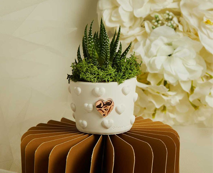 Il Vasetto Cuoricini Claraluna con Applicazione Oro Rosa e Piantina Grassa è una bomboniera raffinata e moderna, pensata per chi desidera un dono che unisca eleganza, dolcezza e design. Realizzato in ceramica bianca con cuoricini in rilievo, presenta al centro un prezioso cuore in finitura oro rosa, simbolo di amore e luminosità.