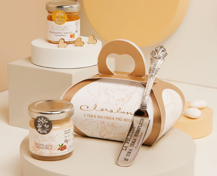 Bomboniera Claraluna con Marmellata di Albicocca, Crema alla Mandorla e Coltellino