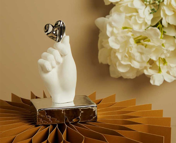 Questa splendida bomboniera raffigura una mano in gesso bianco, modellata con cura artigianale, che stringe un cuore lucido color Silver, simbolo di affetto, protezione e legame eterno. La base in ceramica Silver aggiunge un tocco di luminosità e prestigio, rendendo questa creazione un piccolo capolavoro decorativo.