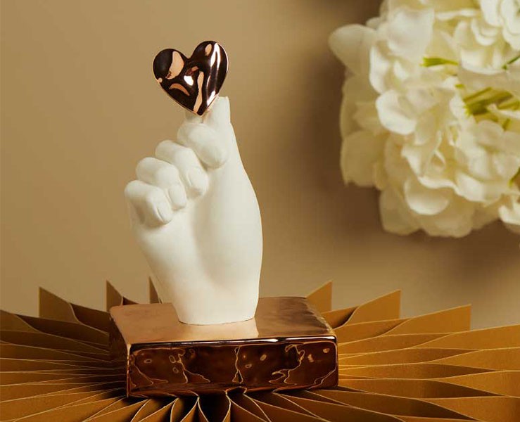 Questa splendida bomboniera raffigura una mano in gesso bianco, modellata con cura artigianale, che stringe un cuore lucido color oro rosa, simbolo di affetto, protezione e legame eterno. La base in ceramica oro rosa aggiunge un tocco di luminosità e prestigio, rendendo questa creazione un piccolo capolavoro decorativo.