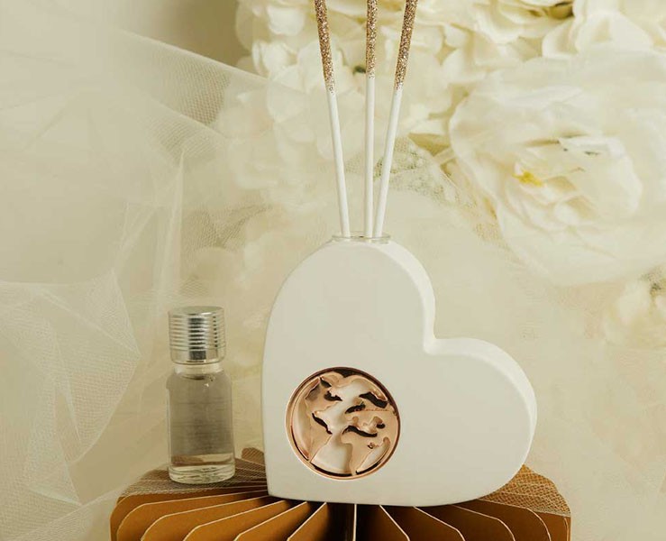 Bomboniera Matrimonio Claraluna 2026 Diffusore Claraluna Cuore Bianco con Mondo oro rosa