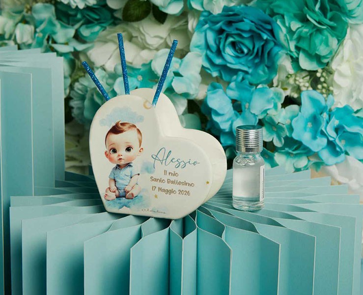 Il Diffusore Cuore Battesimo Maschietto Claraluna è una bomboniera raffinata e ricca di dolcezza, perfetta per celebrare il giorno speciale del Santo Battesimo del tuo bambino. La forma a cuore, simbolo di amore puro, accoglie l’illustrazione tenerissima del bimbo dagli occhi luminosi, rendendo questo profumatore un ricordo unico e pieno di emozione.