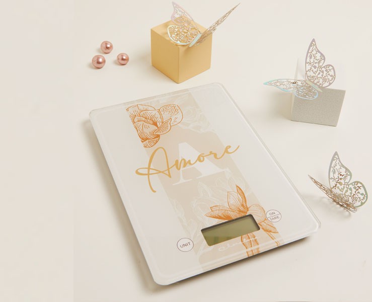 Una bilancia elettronica dal design raffinato, decorata con il tema "Amore". Perfetta per arricchire la cucina con un tocco romantico e funzionale. Ideale come bomboniera per matrimoni o come regalo speciale.
