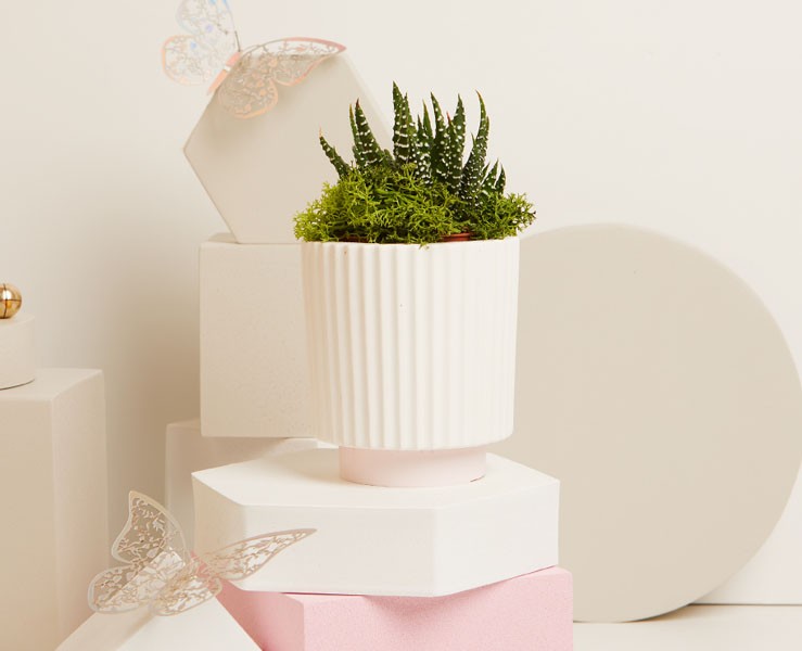 - Design: Vasetto bianco con piantina grassa, perfetto per una decorazione fresca e moderna