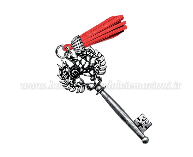 Celebra il tuo traguardo accademico con questa elegante bomboniera per laurea, raffigurante una chiave decorata con ciondolo musica. Realizzata in metallo di alta qualità, ricoperto in argento e rifinita a mano, questa miniatura è un autentico capolavoro artigianale Made in Italy. La nappina rossa, simbolo tradizionale di laurea, aggiunge un tocco di colore e significato. Misura circa 8,5 cm di altezza, ideale come dono raffinato e prezioso.