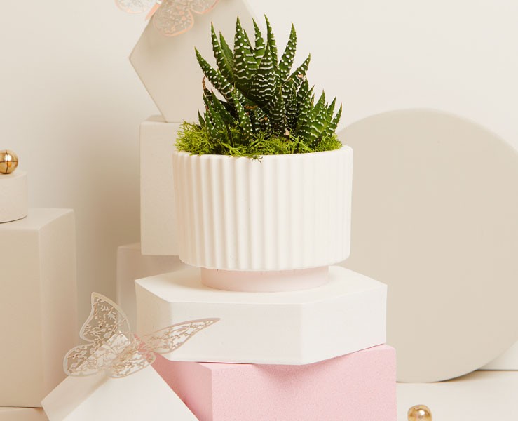 - Design: Vasetto con piantina e base rosa, perfetto per decorare con uno stile moderno e delicato