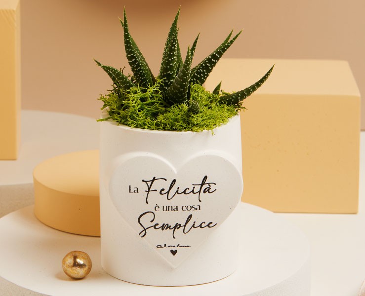 La collezione Claraluna 2025 propone una bomboniera raffinata e moderna: il vasetto con piantina in porcellana, dalle dimensioni di 7 x 8 cm. Questo elegante vasetto, con la scritta "La felicità è una cosa semplice" e una piantina decorativa, è perfetto per aggiungere un tocco di serenità e bellezza naturale agli eventi, rendendolo ideale per matrimoni, comunioni, battesimi, compleanni e anniversari.