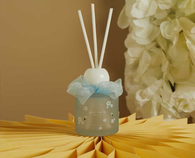 Il flacone in vetro satinato color azzurro tenue avvolge lo sguardo in un’atmosfera serena e luminosa, impreziosito da petali bianchi e piccoli dettagli floreali che donano un tocco di eleganza naturale. La profumazione da 50 ml diffonde un aroma fresco e leggero, ideale per creare un ambiente accogliente in qualunque spazio della casa.