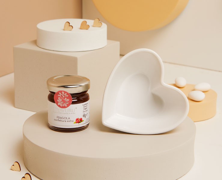 Un'idea raffinata e dolce, questa bomboniera include una splendida ciotolina a forma di cuore in porcellana, accompagnata da una deliziosa marmellata di fragola da 40 grammi. Perfetta per aggiungere un tocco gourmet e romantico alla tua cerimonia.