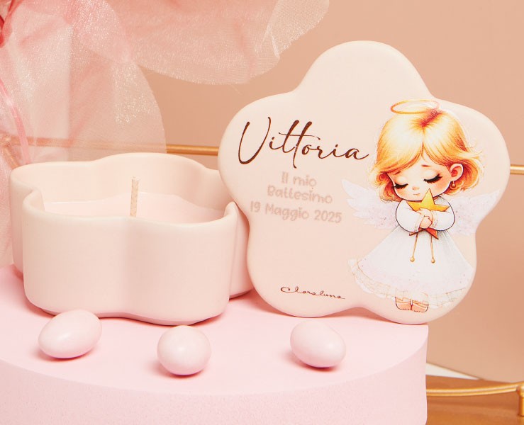 Bomboniera Claraluna scatolina angioletto rosa con candela personalizzabile