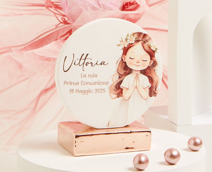 Bomboniera Claraluna icona bambina con base dorata con scritta personalizzabile