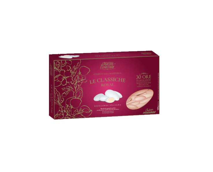 Royal Rosa è un confetto raffinato che racchiude una pregiata mandorla pelata calibro 38, avvolta da un sottile strato di zucchero bianco, regala un perfetto equilibrio tra croccantezza e dolcezza, ideale per ogni occasione speciale.