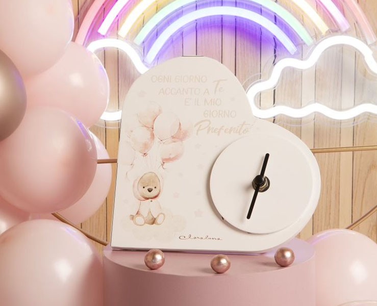 Bomboniera Nascita Battesimo Claraluna orologio cuore con orsetto rosa