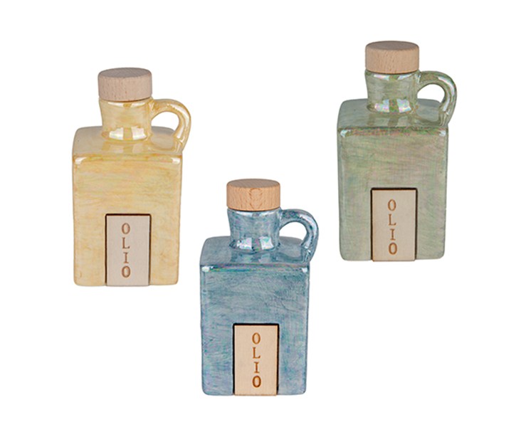 Placca Identificativa: Sul fronte è applicata una placchetta rettangolare coordinata con la scritta calligrafica "OLIO", che facilita l'identificazione del contenuto con eleganza.