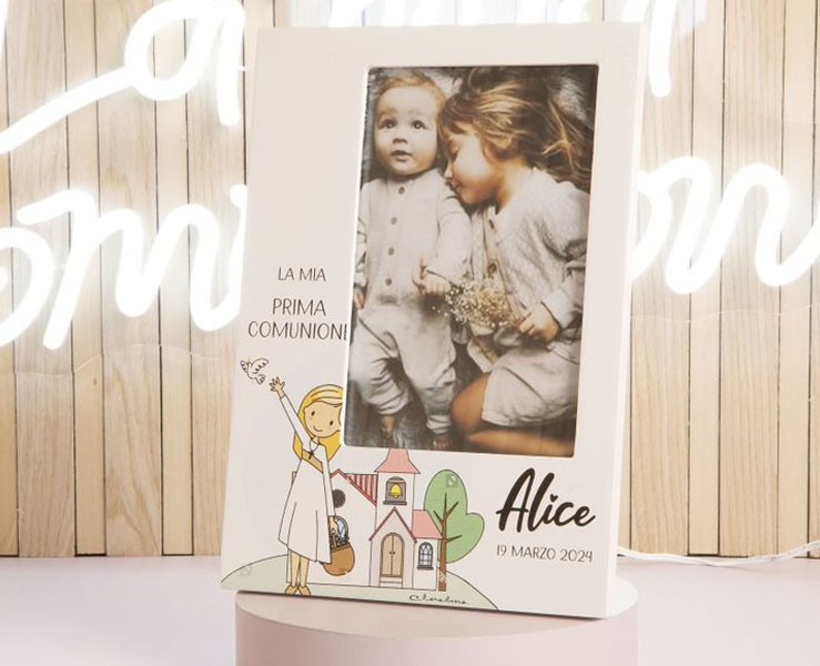Bomboniera Comunione Battesimo Cresima Claraluna portafoto con scritta personalizzabile