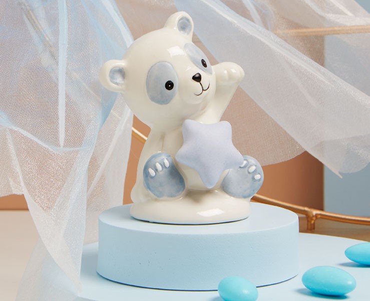 Bomboniera le stelle Salvadanaio Orsetto in Porcellana azzurra con Shopper