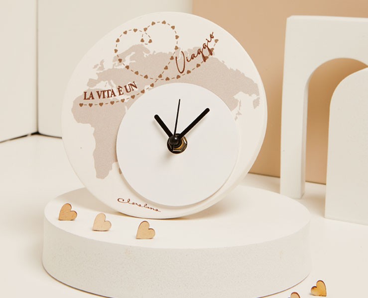 Questo incantevole orologio decorato con il tema "Viaggio", realizzato in legno e dal diametro di 14 cm, è un simbolo perfetto per gli sposi che amano esplorare il mondo insieme. Con il design raffigurante una mappa del mondo e la scritta "La vita è un viaggio", rappresenta un'idea bomboniera unica, capace di unire eleganza e significato profondo.