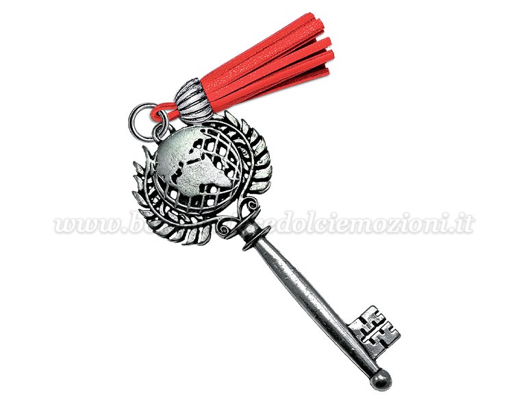 Celebra il tuo traguardo accademico con questa elegante bomboniera per laurea, raffigurante una chiave decorata con il globo che rappresenta la conoscenza globale, la comprensione culturale e l'interconnessione tra i popoli, perfetto per lauree orientate verso lo studio e la gestione di tematiche internazionali e territoriali.